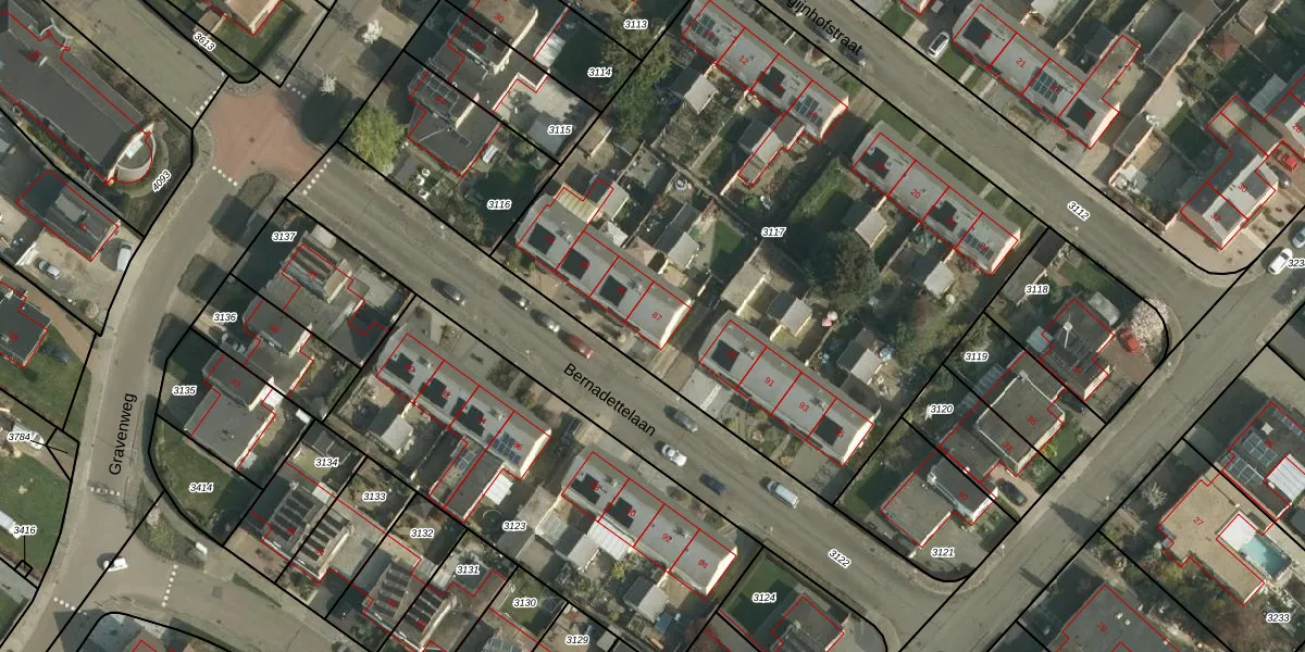 Het perceel waarop Bernadettelaan 87 staat heeft een oppervlakte van 3595 m². Dit is een zeer groot perceel. De perceeloppervlakte wordt geregistreerd door het Kadaster. Gedetailleerde informatie over de maten van dit perceel kunt u vinden in het rapport Kadastrale kaart met maatvoering van Bernadettelaan 87.