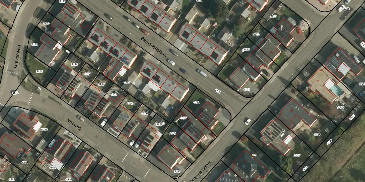 Het perceel waarop Bernadettelaan 94 staat heeft een oppervlakte van 1594 m². Dit is een zeer groot perceel. De perceeloppervlakte wordt geregistreerd door het Kadaster. Gedetailleerde informatie over de maten van dit perceel kunt u vinden in het rapport Kadastrale kaart met maatvoering van Bernadettelaan 94.