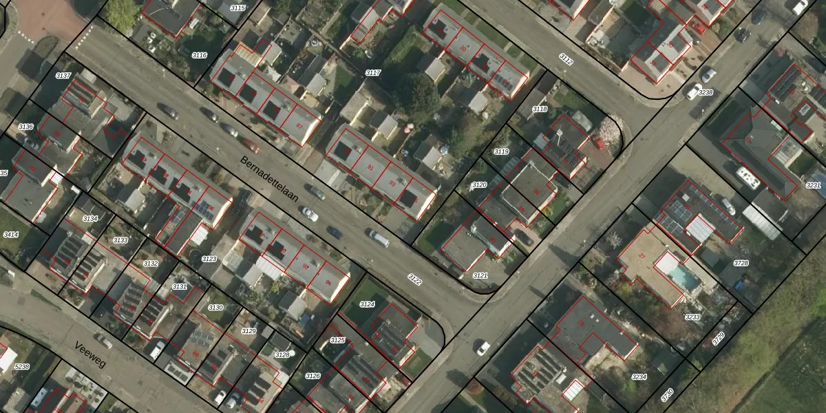 Het perceel waarop Bernadettelaan 95 staat heeft een oppervlakte van 3595 m². Dit is een zeer groot perceel. De perceeloppervlakte wordt geregistreerd door het Kadaster. Gedetailleerde informatie over de maten van dit perceel kunt u vinden in het rapport Kadastrale kaart met maatvoering van Bernadettelaan 95.