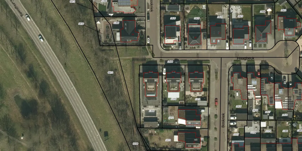Het perceel waarop Boskriek 14 staat heeft een oppervlakte van 625 m². Dit is een groot perceel. De perceeloppervlakte wordt geregistreerd door het Kadaster. Gedetailleerde informatie over de maten van dit perceel kunt u vinden in het rapport Kadastrale kaart met maatvoering van Boskriek 14.