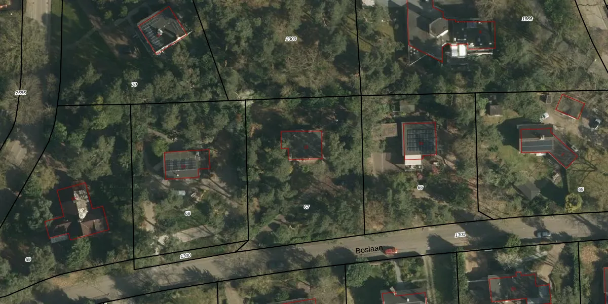 Het perceel waarop Boslaan 13 staat heeft een oppervlakte van 1820 m². Dit is een zeer groot perceel. De perceeloppervlakte wordt geregistreerd door het Kadaster. Gedetailleerde informatie over de maten van dit perceel kunt u vinden in het rapport Kadastrale kaart met maatvoering van Boslaan 13.