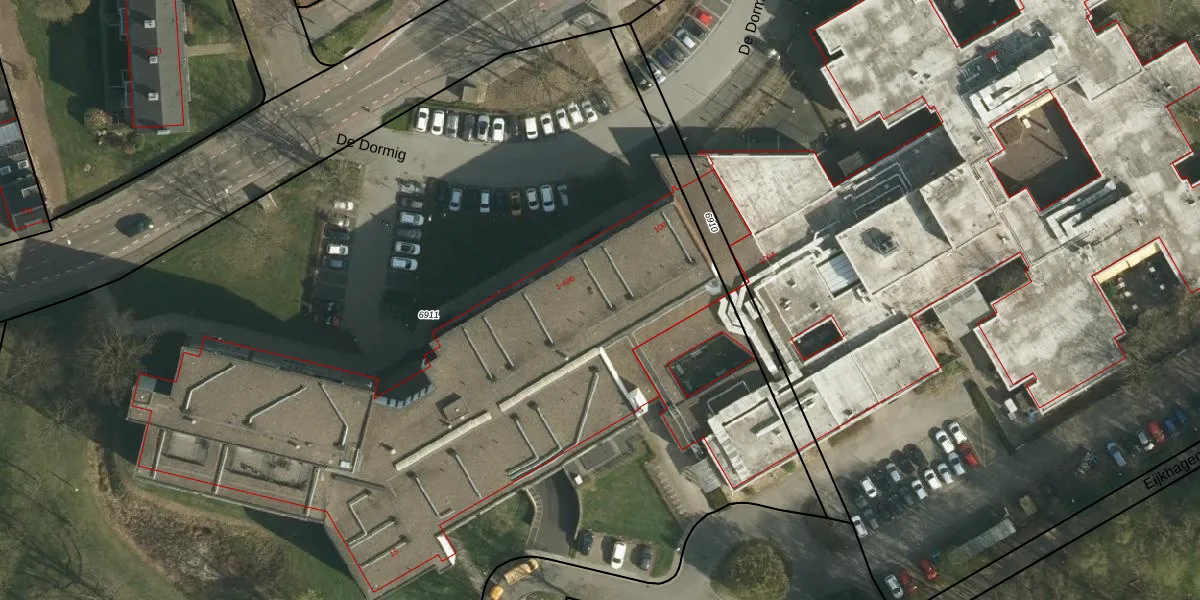 Het perceel waarop De Dormig 125 staat heeft een oppervlakte van 1,0 ha. Dit is een zeer groot perceel. De perceeloppervlakte wordt geregistreerd door het Kadaster. Gedetailleerde informatie over de maten van dit perceel kunt u vinden in het rapport Kadastrale kaart met maatvoering van De Dormig 125.