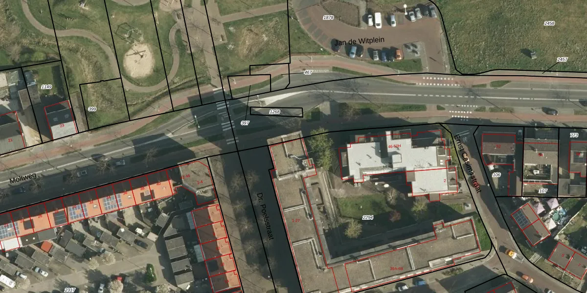 Dr. Poelsstraat 1 is gelegen op kadastraal perceel SBG01E2294. Deze kadastrale aanduiding is uniek en wordt gebruikt door het Kadaster om eigendomsrechten en andere zakelijke rechten vast te leggen. Het perceel maakt onderdeel uit van de kadastrale gemeente Schaesberg.