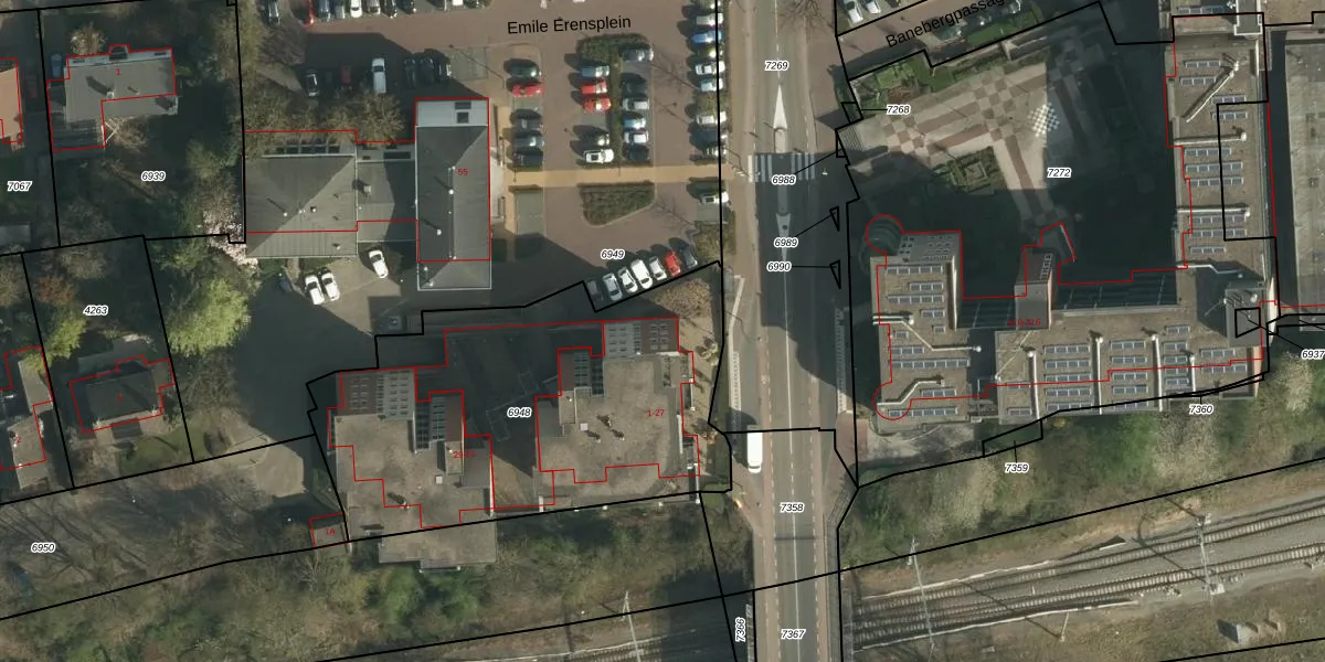 Emile Erensplein 1 is gelegen op kadastraal perceel SBG01B6948. Deze kadastrale aanduiding is uniek en wordt gebruikt door het Kadaster om eigendomsrechten en andere zakelijke rechten vast te leggen. Het perceel maakt onderdeel uit van de kadastrale gemeente Schaesberg.