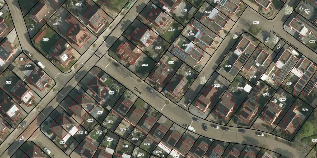 Het perceel waarop Gank 120 staat heeft een oppervlakte van 315 m². Dit is een groot perceel. De perceeloppervlakte wordt geregistreerd door het Kadaster. Gedetailleerde informatie over de maten van dit perceel kunt u vinden in het rapport Kadastrale kaart met maatvoering van Gank 120.