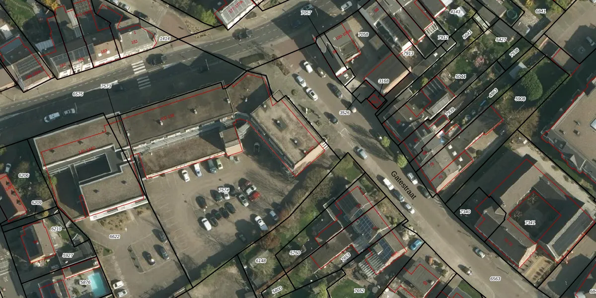 Het perceel waarop Gatestraat 107 staat heeft een oppervlakte van 3013 m². Dit is een zeer groot perceel. De perceeloppervlakte wordt geregistreerd door het Kadaster. Gedetailleerde informatie over de maten van dit perceel kunt u vinden in het rapport Kadastrale kaart met maatvoering van Gatestraat 107.