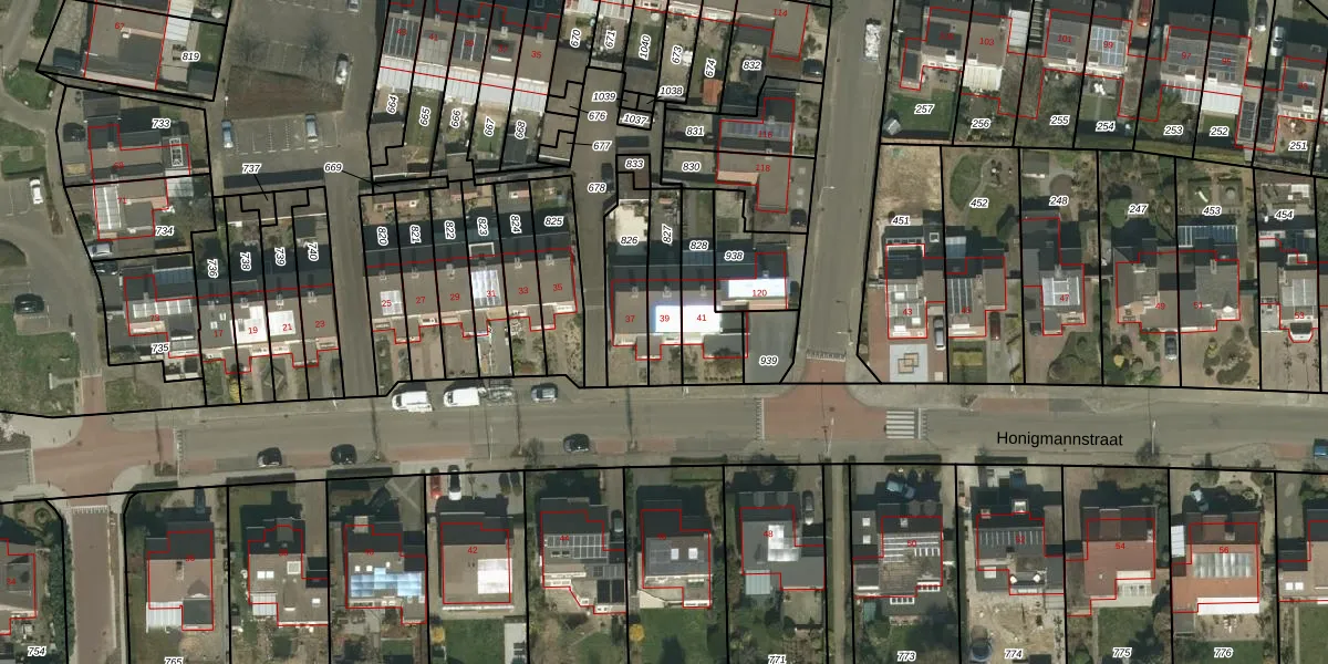 Honigmannstraat 39 is gelegen op kadastraal perceel LGF00C827. Deze kadastrale aanduiding is uniek en wordt gebruikt door het Kadaster om eigendomsrechten en andere zakelijke rechten vast te leggen. Het perceel maakt onderdeel uit van de kadastrale gemeente Landgraaf.