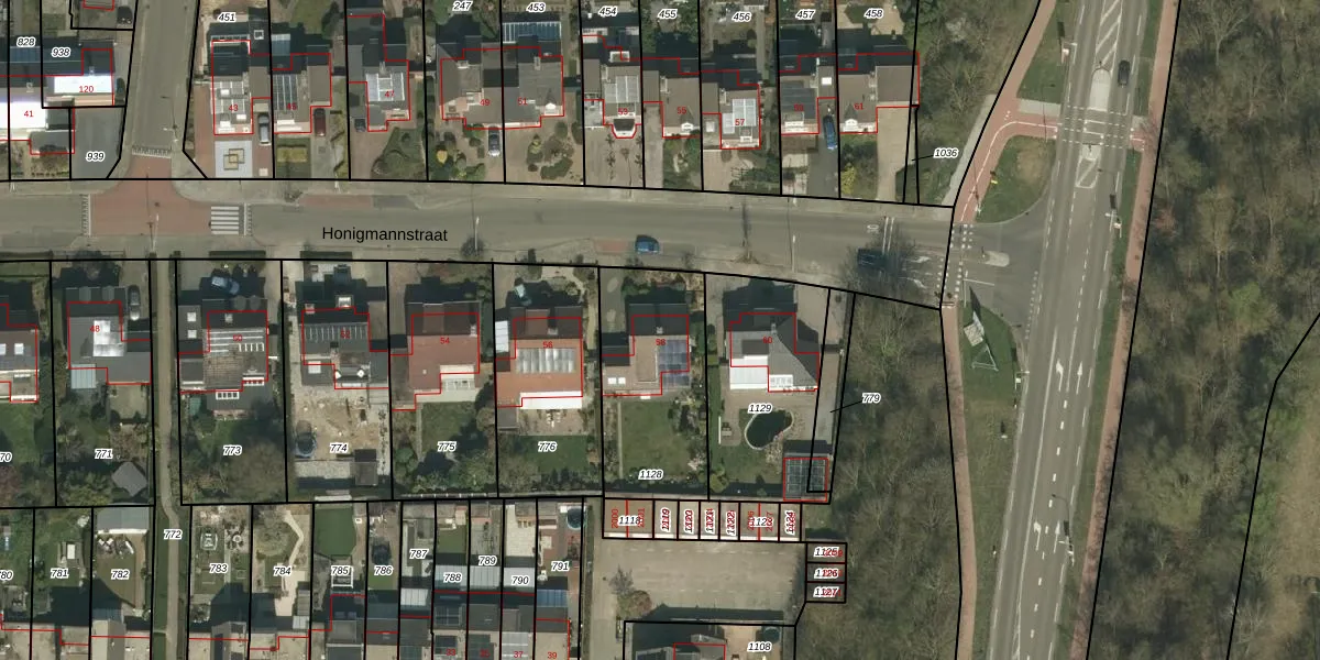 Het perceel waarop Honigmannstraat 58 staat heeft een oppervlakte van 555 m². Dit is een groot perceel. De perceeloppervlakte wordt geregistreerd door het Kadaster. Gedetailleerde informatie over de maten van dit perceel kunt u vinden in het rapport Kadastrale kaart met maatvoering van Honigmannstraat 58.