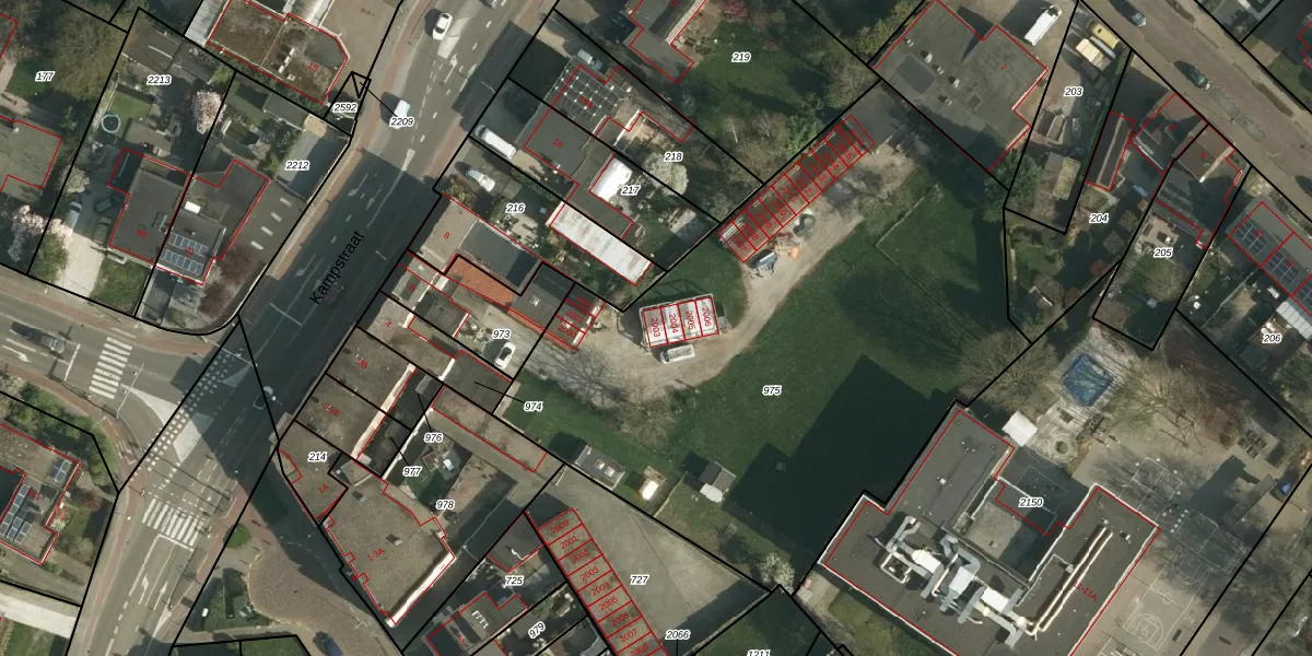 Het perceel waarop Kampstraat 2003 staat heeft een oppervlakte van 3377 m². Dit is een zeer groot perceel. De perceeloppervlakte wordt geregistreerd door het Kadaster. Gedetailleerde informatie over de maten van dit perceel kunt u vinden in het rapport Kadastrale kaart met maatvoering van Kampstraat 2003.