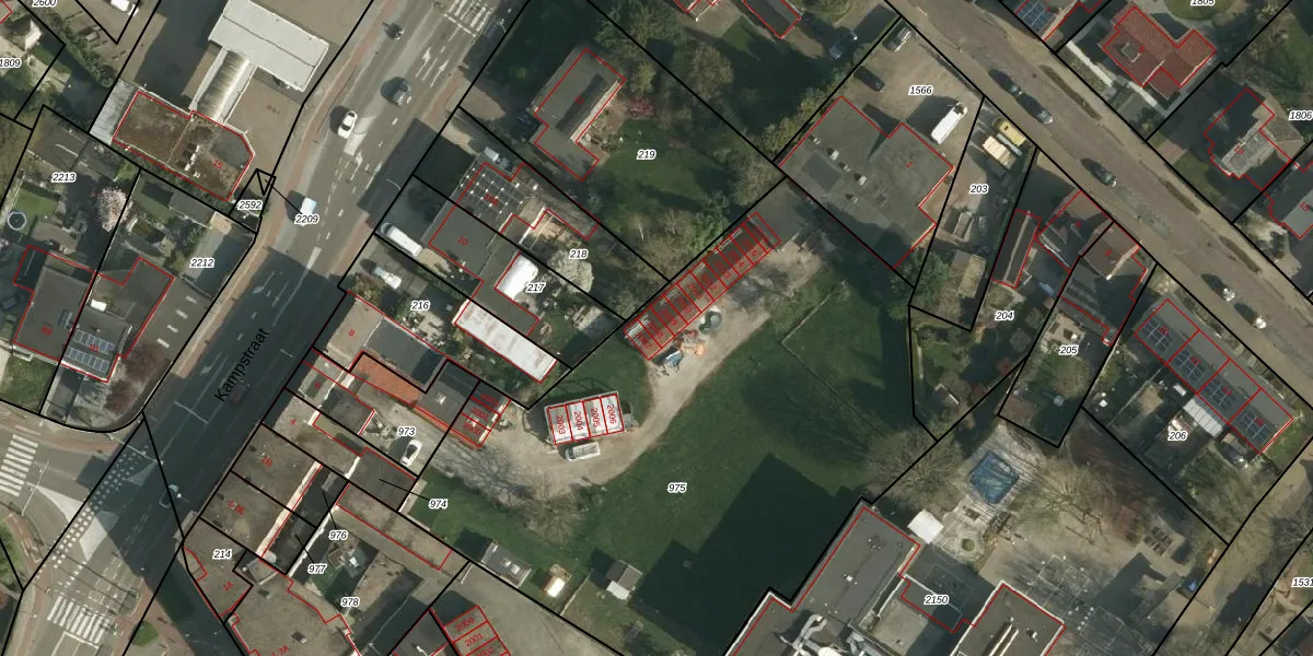 Het perceel waarop Kampstraat 2008 staat heeft een oppervlakte van 3377 m². Dit is een zeer groot perceel. De perceeloppervlakte wordt geregistreerd door het Kadaster. Gedetailleerde informatie over de maten van dit perceel kunt u vinden in het rapport Kadastrale kaart met maatvoering van Kampstraat 2008.