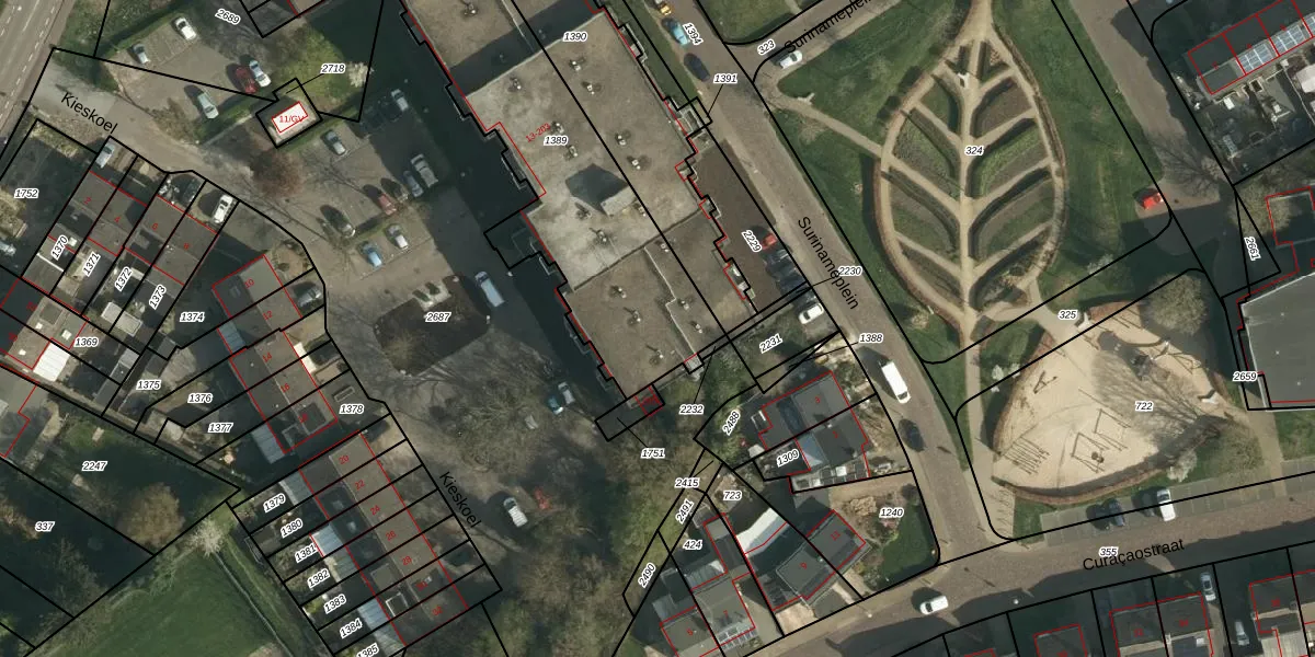 Het perceel waarop Kieskoel 113 staat heeft een oppervlakte van 1230 m². Dit is een zeer groot perceel. De perceeloppervlakte wordt geregistreerd door het Kadaster. Gedetailleerde informatie over de maten van dit perceel kunt u vinden in het rapport Kadastrale kaart met maatvoering van Kieskoel 113.