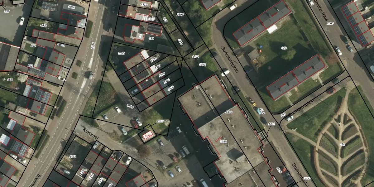 Het perceel waarop Kieskoel 13 staat heeft een oppervlakte van 1230 m². Dit is een zeer groot perceel. De perceeloppervlakte wordt geregistreerd door het Kadaster. Gedetailleerde informatie over de maten van dit perceel kunt u vinden in het rapport Kadastrale kaart met maatvoering van Kieskoel 13.