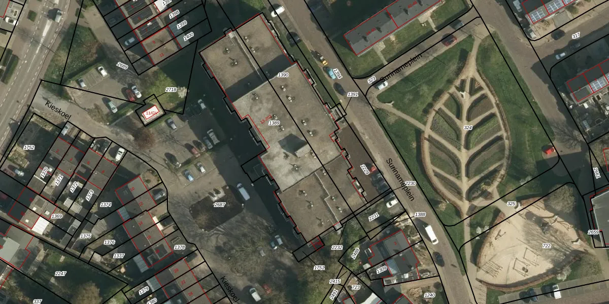 Het perceel waarop Kieskoel 173 staat heeft een oppervlakte van 1230 m². Dit is een zeer groot perceel. De perceeloppervlakte wordt geregistreerd door het Kadaster. Gedetailleerde informatie over de maten van dit perceel kunt u vinden in het rapport Kadastrale kaart met maatvoering van Kieskoel 173.