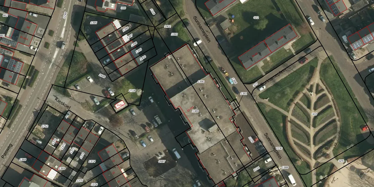 Het perceel waarop Kieskoel 45 staat heeft een oppervlakte van 1230 m². Dit is een zeer groot perceel. De perceeloppervlakte wordt geregistreerd door het Kadaster. Gedetailleerde informatie over de maten van dit perceel kunt u vinden in het rapport Kadastrale kaart met maatvoering van Kieskoel 45.