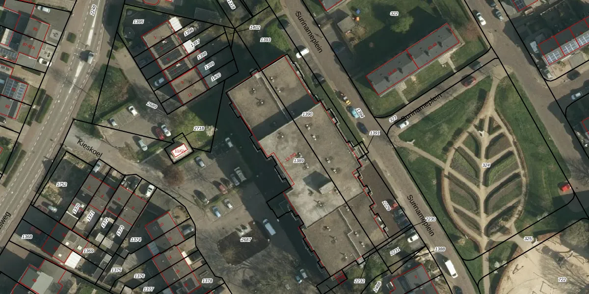 Het perceel waarop Kieskoel 53 staat heeft een oppervlakte van 1230 m². Dit is een zeer groot perceel. De perceeloppervlakte wordt geregistreerd door het Kadaster. Gedetailleerde informatie over de maten van dit perceel kunt u vinden in het rapport Kadastrale kaart met maatvoering van Kieskoel 53.
