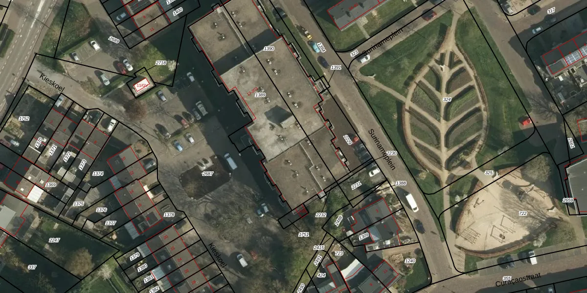 Het perceel waarop Kieskoel 95 staat heeft een oppervlakte van 1230 m². Dit is een zeer groot perceel. De perceeloppervlakte wordt geregistreerd door het Kadaster. Gedetailleerde informatie over de maten van dit perceel kunt u vinden in het rapport Kadastrale kaart met maatvoering van Kieskoel 95.