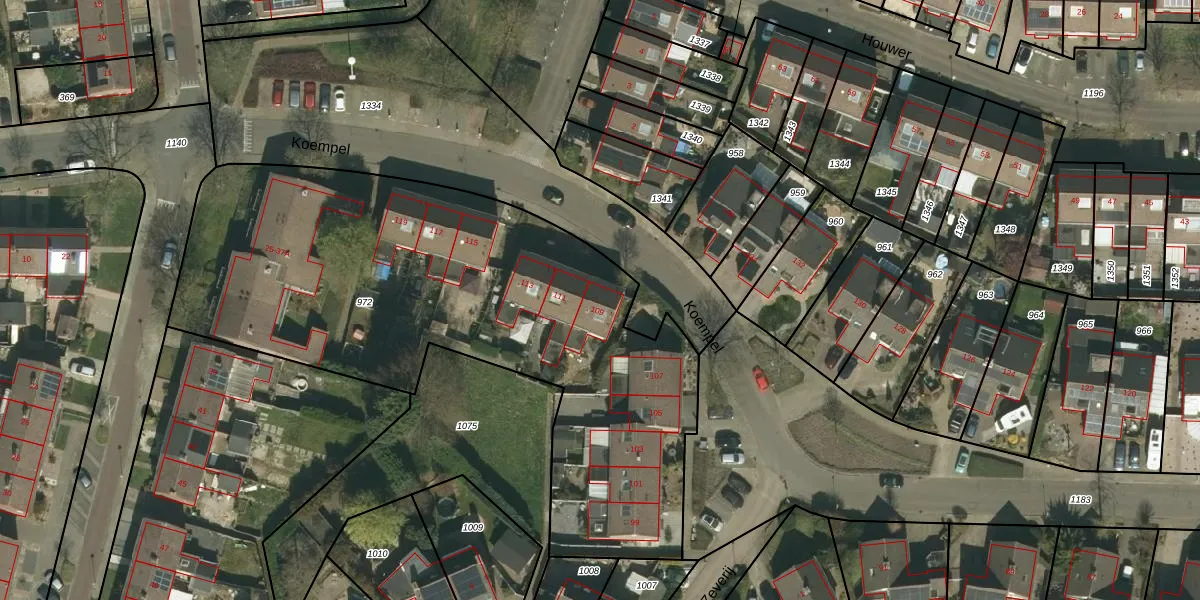 Het perceel waarop Koempel 109 staat heeft een oppervlakte van 2915 m². Dit is een zeer groot perceel. De perceeloppervlakte wordt geregistreerd door het Kadaster. Gedetailleerde informatie over de maten van dit perceel kunt u vinden in het rapport Kadastrale kaart met maatvoering van Koempel 109.