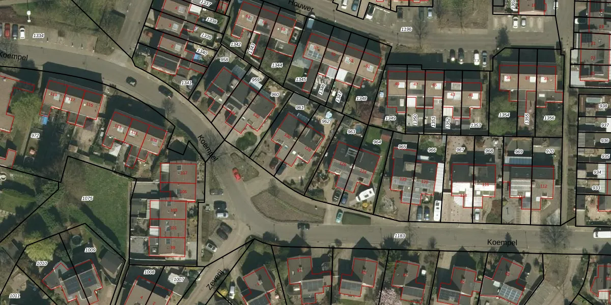 Het perceel waarop Koempel 128 staat heeft een oppervlakte van 296 m². Dit is een middelgroot perceel. De perceeloppervlakte wordt geregistreerd door het Kadaster. Gedetailleerde informatie over de maten van dit perceel kunt u vinden in het rapport Kadastrale kaart met maatvoering van Koempel 128.
