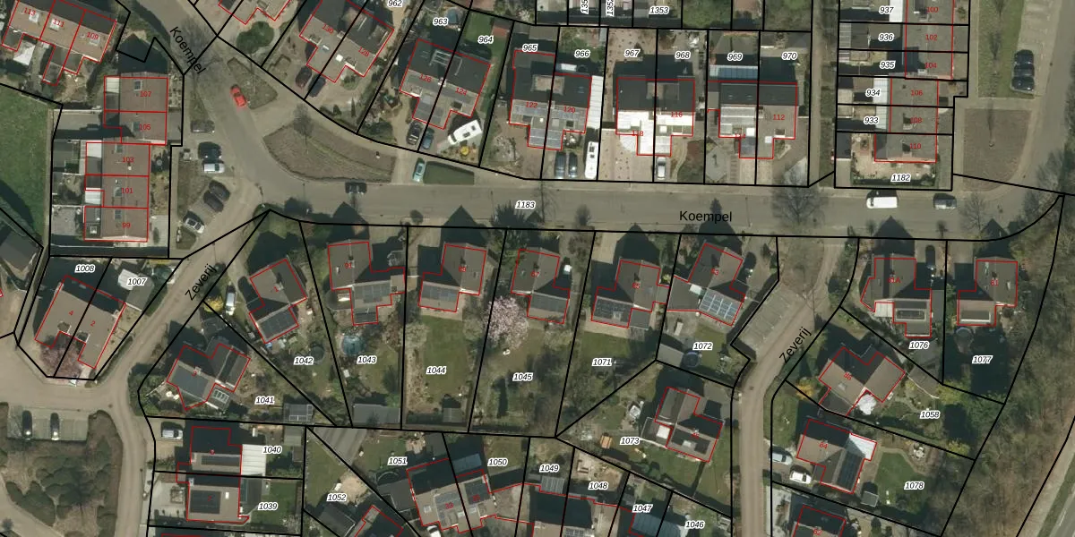 Het perceel waarop Koempel 87 staat heeft een oppervlakte van 630 m². Dit is een groot perceel. De perceeloppervlakte wordt geregistreerd door het Kadaster. Gedetailleerde informatie over de maten van dit perceel kunt u vinden in het rapport Kadastrale kaart met maatvoering van Koempel 87.