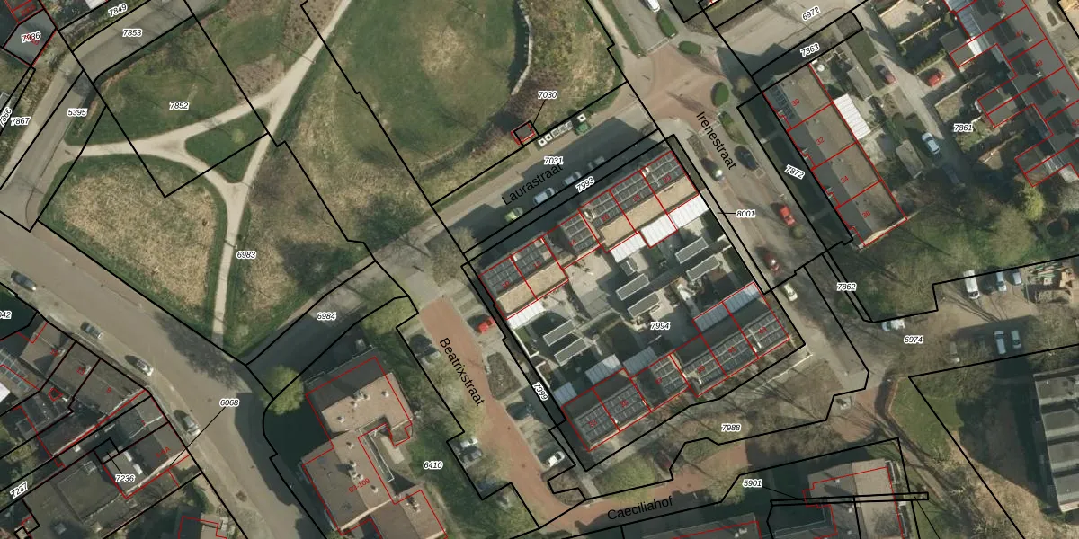 Het perceel waarop Laurastraat 12 staat heeft een oppervlakte van 1981 m². Dit is een zeer groot perceel. De perceeloppervlakte wordt geregistreerd door het Kadaster. Gedetailleerde informatie over de maten van dit perceel kunt u vinden in het rapport Kadastrale kaart met maatvoering van Laurastraat 12.