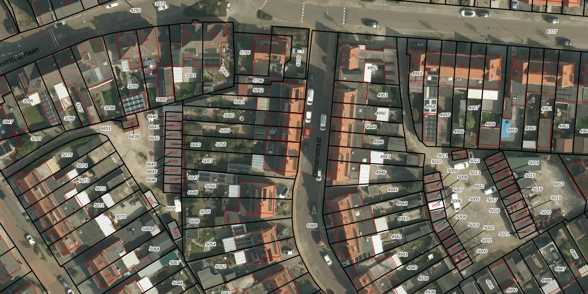 Olmenstraat 12 is gelegen op kadastraal perceel UBH00C5058. Deze kadastrale aanduiding is uniek en wordt gebruikt door het Kadaster om eigendomsrechten en andere zakelijke rechten vast te leggen. Het perceel maakt onderdeel uit van de kadastrale gemeente Ubach over Worms.
