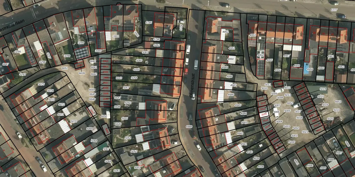 Olmenstraat 14 is gelegen op kadastraal perceel UBH00C5057. Deze kadastrale aanduiding is uniek en wordt gebruikt door het Kadaster om eigendomsrechten en andere zakelijke rechten vast te leggen. Het perceel maakt onderdeel uit van de kadastrale gemeente Ubach over Worms.