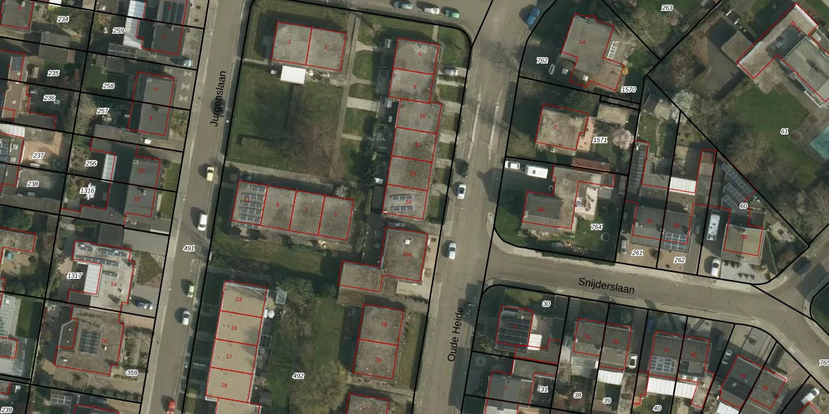 Het perceel waarop Oude Heide 16 staat heeft een oppervlakte van 9915 m². Dit is een zeer groot perceel. De perceeloppervlakte wordt geregistreerd door het Kadaster. Gedetailleerde informatie over de maten van dit perceel kunt u vinden in het rapport Kadastrale kaart met maatvoering van Oude Heide 16.