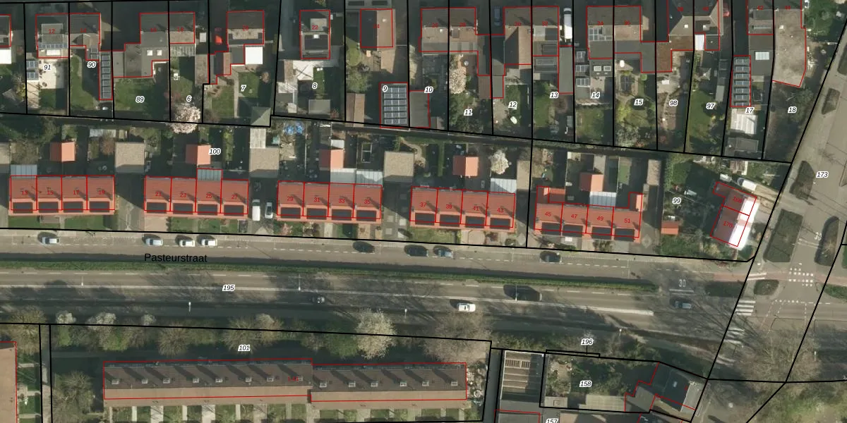 Het perceel waarop Pasteurstraat 37 staat heeft een oppervlakte van 4284 m². Dit is een zeer groot perceel. De perceeloppervlakte wordt geregistreerd door het Kadaster. Gedetailleerde informatie over de maten van dit perceel kunt u vinden in het rapport Kadastrale kaart met maatvoering van Pasteurstraat 37.