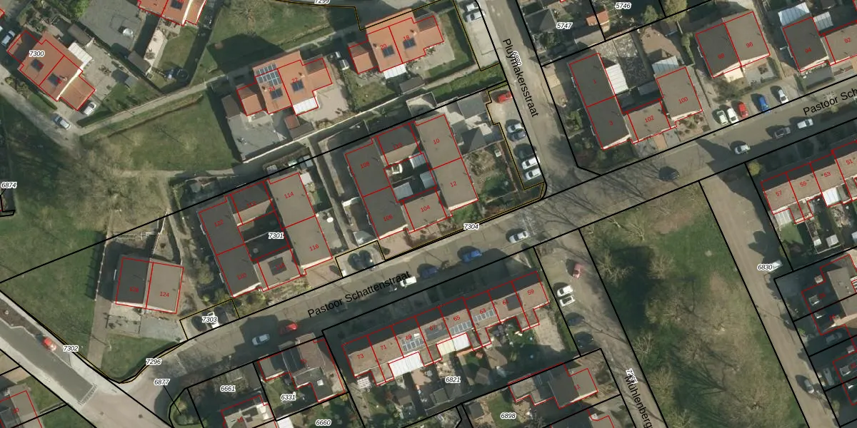 Pastoor Schattenstraat 104 is gelegen op kadastraal perceel SBG01B7301. Deze kadastrale aanduiding is uniek en wordt gebruikt door het Kadaster om eigendomsrechten en andere zakelijke rechten vast te leggen. Het perceel maakt onderdeel uit van de kadastrale gemeente Schaesberg.