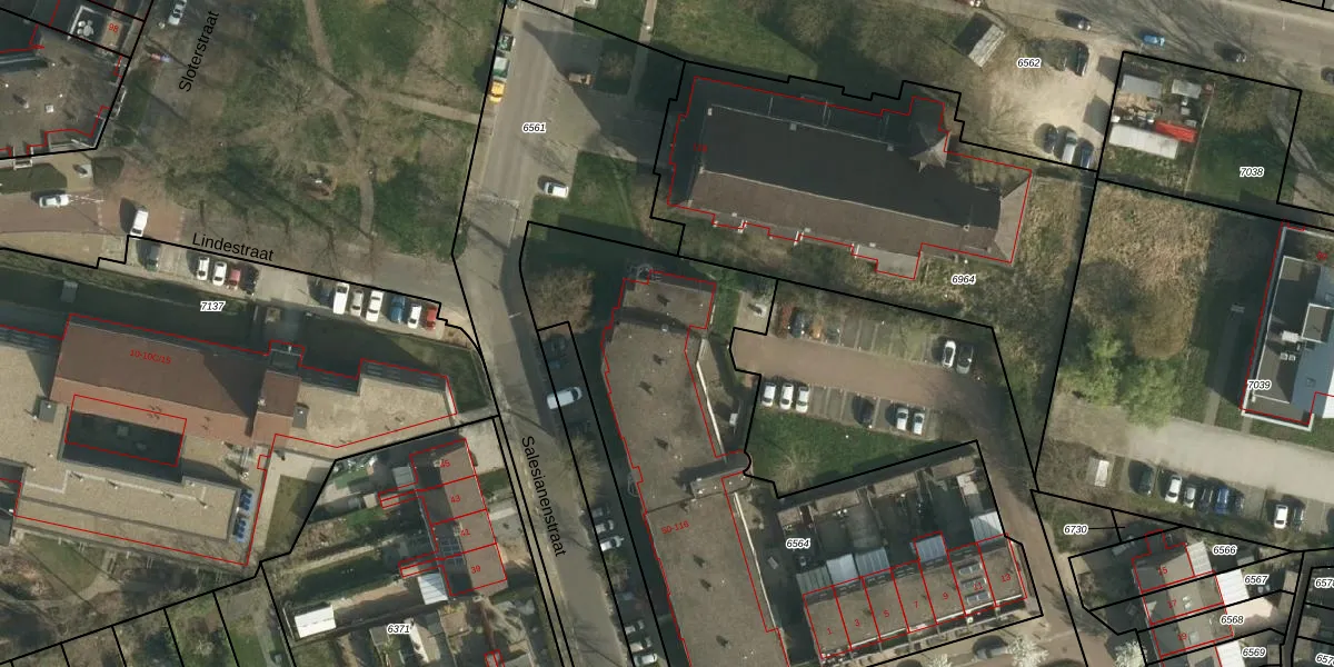 Het perceel waarop Salesianenstraat 84 staat heeft een oppervlakte van 2645 m². Dit is een zeer groot perceel. De perceeloppervlakte wordt geregistreerd door het Kadaster. Gedetailleerde informatie over de maten van dit perceel kunt u vinden in het rapport Kadastrale kaart met maatvoering van Salesianenstraat 84.