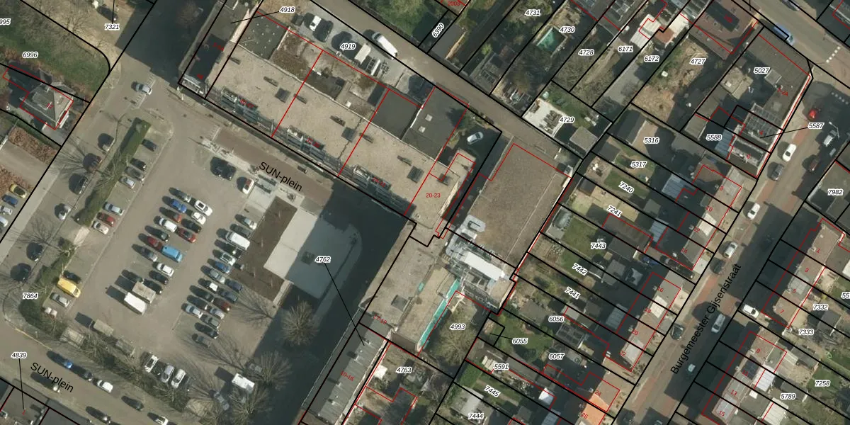 Het perceel waarop SUN-plein 22 staat heeft een oppervlakte van 2040 m². Dit is een zeer groot perceel. De perceeloppervlakte wordt geregistreerd door het Kadaster. Gedetailleerde informatie over de maten van dit perceel kunt u vinden in het rapport Kadastrale kaart met maatvoering van SUN-plein 22.