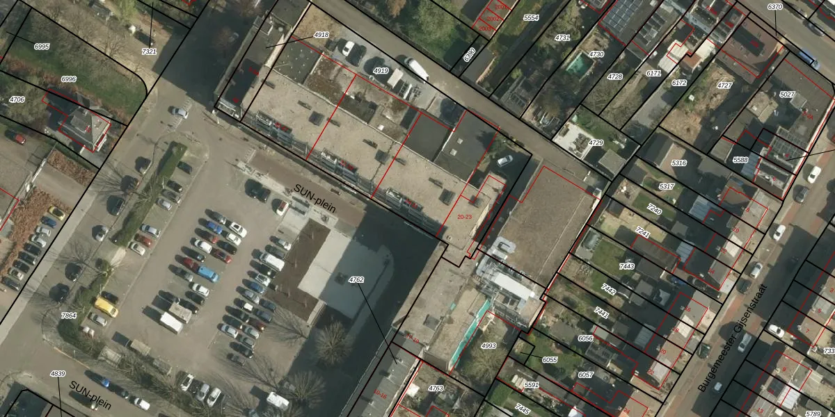 Het perceel waarop SUN-plein 27 staat heeft een oppervlakte van 2040 m². Dit is een zeer groot perceel. De perceeloppervlakte wordt geregistreerd door het Kadaster. Gedetailleerde informatie over de maten van dit perceel kunt u vinden in het rapport Kadastrale kaart met maatvoering van SUN-plein 27.