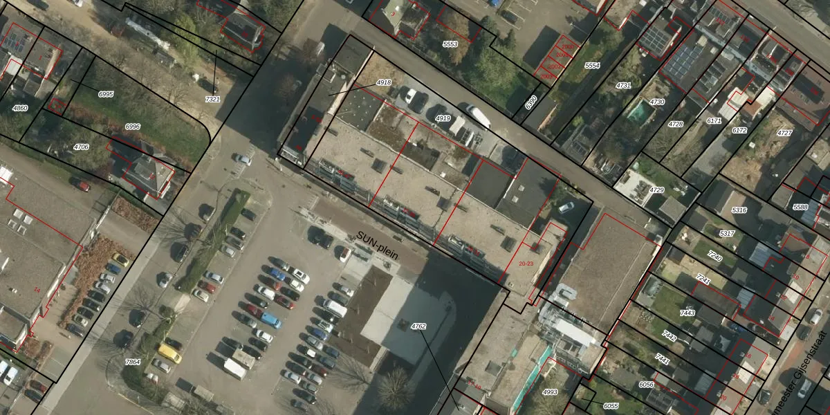 Het perceel waarop SUN-plein 37 staat heeft een oppervlakte van 2040 m². Dit is een zeer groot perceel. De perceeloppervlakte wordt geregistreerd door het Kadaster. Gedetailleerde informatie over de maten van dit perceel kunt u vinden in het rapport Kadastrale kaart met maatvoering van SUN-plein 37.