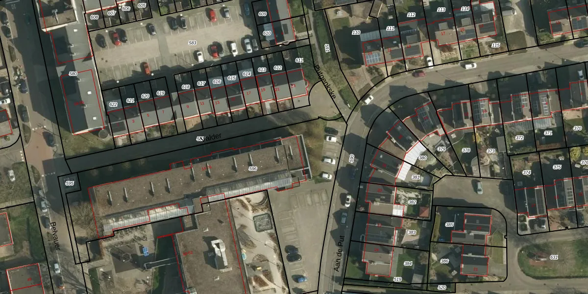 Het perceel waarop Valder 62 staat heeft een oppervlakte van 2615 m². Dit is een zeer groot perceel. De perceeloppervlakte wordt geregistreerd door het Kadaster. Gedetailleerde informatie over de maten van dit perceel kunt u vinden in het rapport Kadastrale kaart met maatvoering van Valder 62.