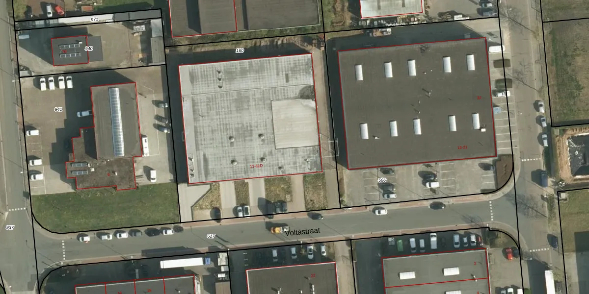 Het perceel waarop Voltastraat 11-B staat heeft een oppervlakte van 3270 m². Dit is een zeer groot perceel. De perceeloppervlakte wordt geregistreerd door het Kadaster. Gedetailleerde informatie over de maten van dit perceel kunt u vinden in het rapport Kadastrale kaart met maatvoering van Voltastraat 11-B.