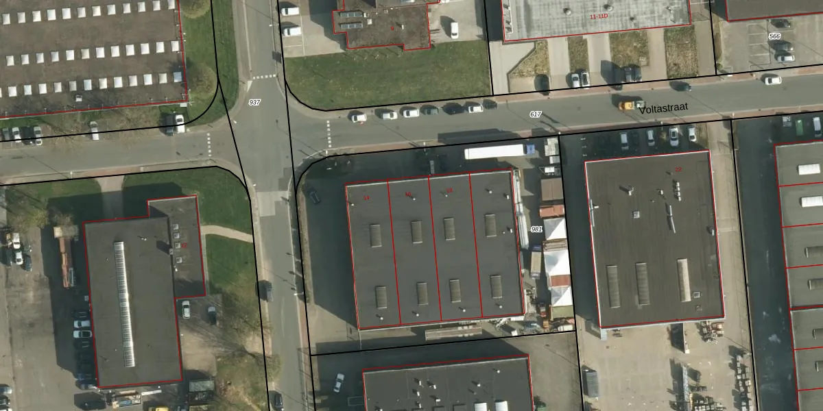 Het perceel waarop Voltastraat 16 staat heeft een oppervlakte van 3085 m². Dit is een zeer groot perceel. De perceeloppervlakte wordt geregistreerd door het Kadaster. Gedetailleerde informatie over de maten van dit perceel kunt u vinden in het rapport Kadastrale kaart met maatvoering van Voltastraat 16.