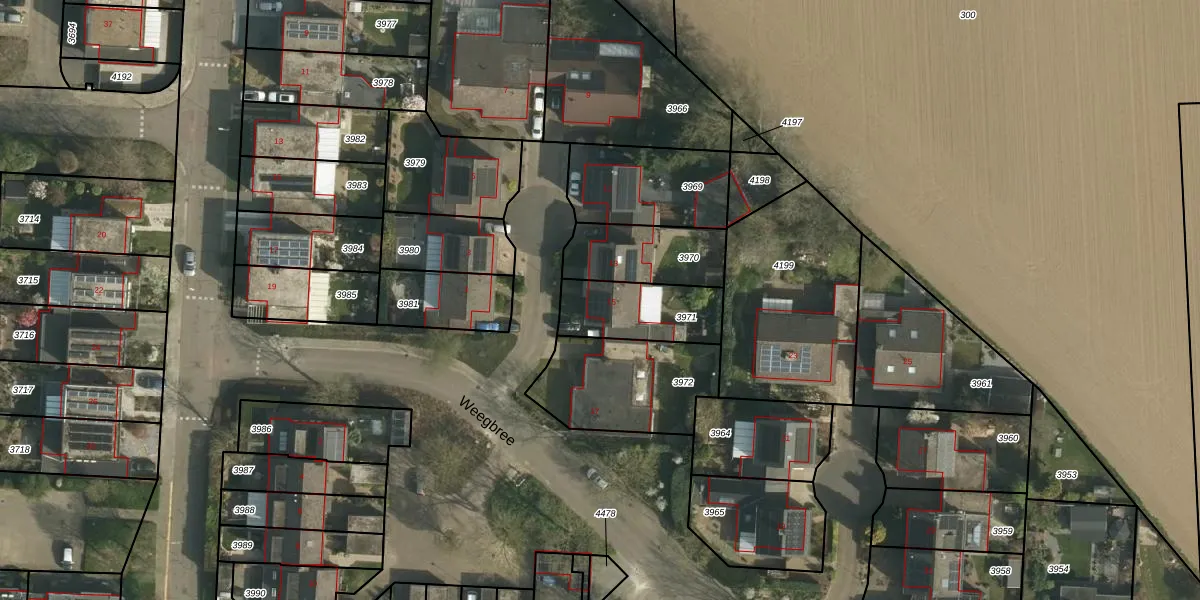 Weegbree 15 is gelegen op kadastraal perceel UBH00B3971. Deze kadastrale aanduiding is uniek en wordt gebruikt door het Kadaster om eigendomsrechten en andere zakelijke rechten vast te leggen. Het perceel maakt onderdeel uit van de kadastrale gemeente Ubach over Worms.