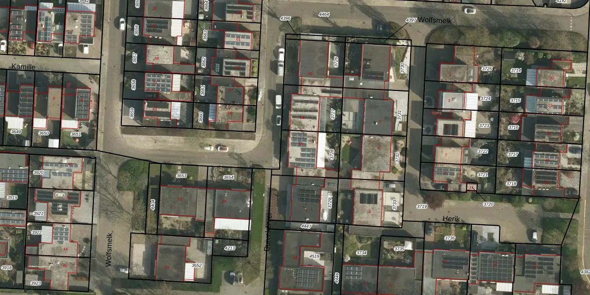 Het perceel waarop Wolfsmelk 56 staat heeft een oppervlakte van 312 m². Dit is een groot perceel. De perceeloppervlakte wordt geregistreerd door het Kadaster. Gedetailleerde informatie over de maten van dit perceel kunt u vinden in het rapport Kadastrale kaart met maatvoering van Wolfsmelk 56.