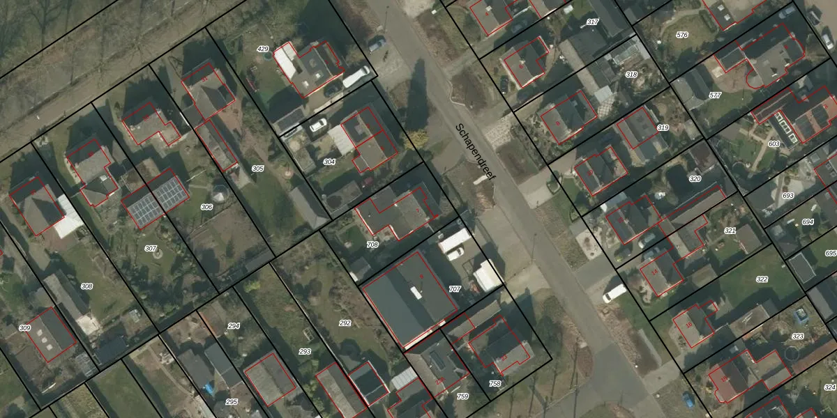 Schapendreef 7 is gelegen op kadastraal perceel WRJ00M708. Deze kadastrale aanduiding is uniek en wordt gebruikt door het Kadaster om eigendomsrechten en andere zakelijke rechten vast te leggen. Het perceel maakt onderdeel uit van de kadastrale gemeente Wanroij.