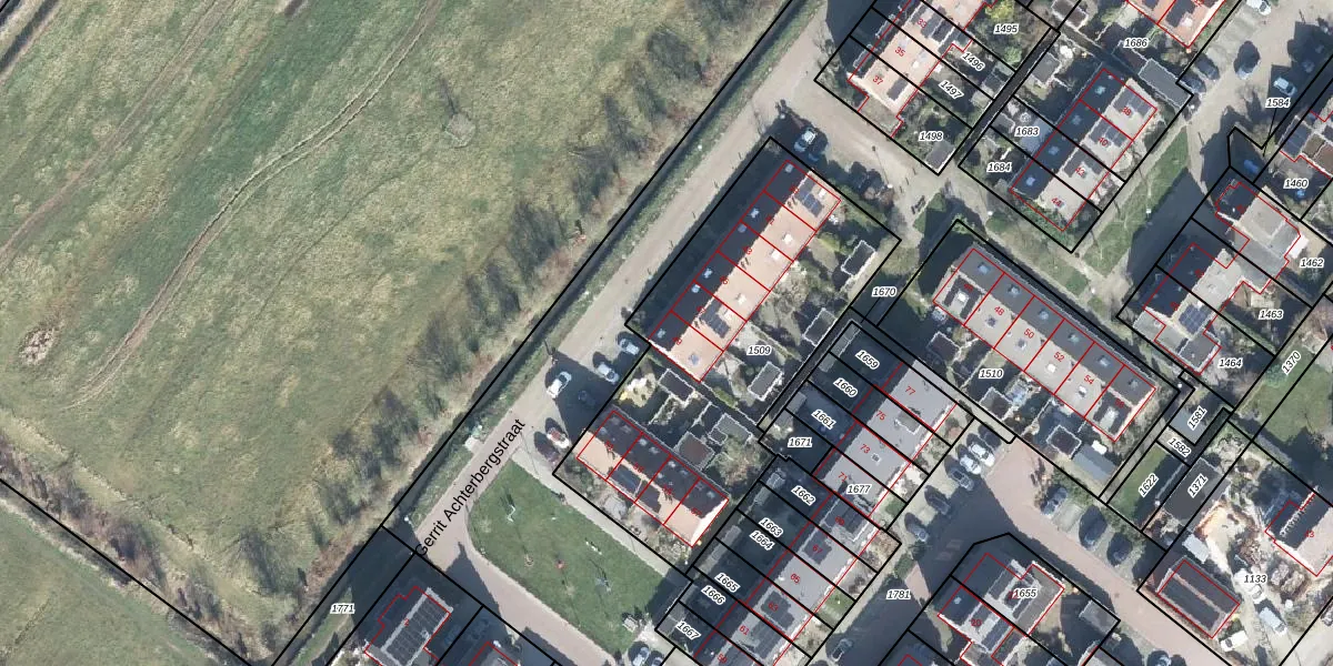 Het perceel waarop Gerrit Achterbergstraat 49 staat heeft een oppervlakte van 1470 m². Dit is een zeer groot perceel. De perceeloppervlakte wordt geregistreerd door het Kadaster. Gedetailleerde informatie over de maten van dit perceel kunt u vinden in het rapport Kadastrale kaart met maatvoering van Gerrit Achterbergstraat 49.
