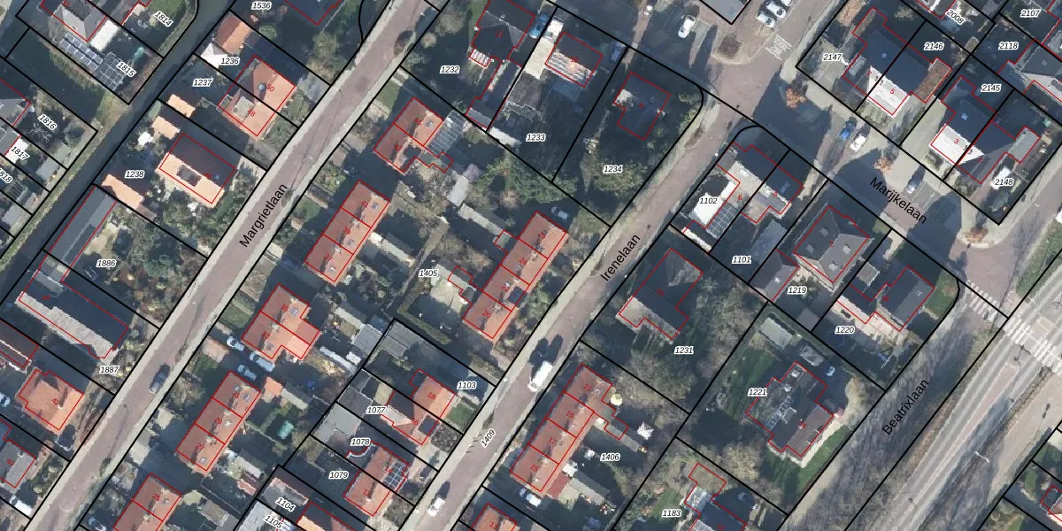 Het perceel waarop Irenelaan 24 staat heeft een oppervlakte van 3550 m². Dit is een zeer groot perceel. De perceeloppervlakte wordt geregistreerd door het Kadaster. Gedetailleerde informatie over de maten van dit perceel kunt u vinden in het rapport Kadastrale kaart met maatvoering van Irenelaan 24.