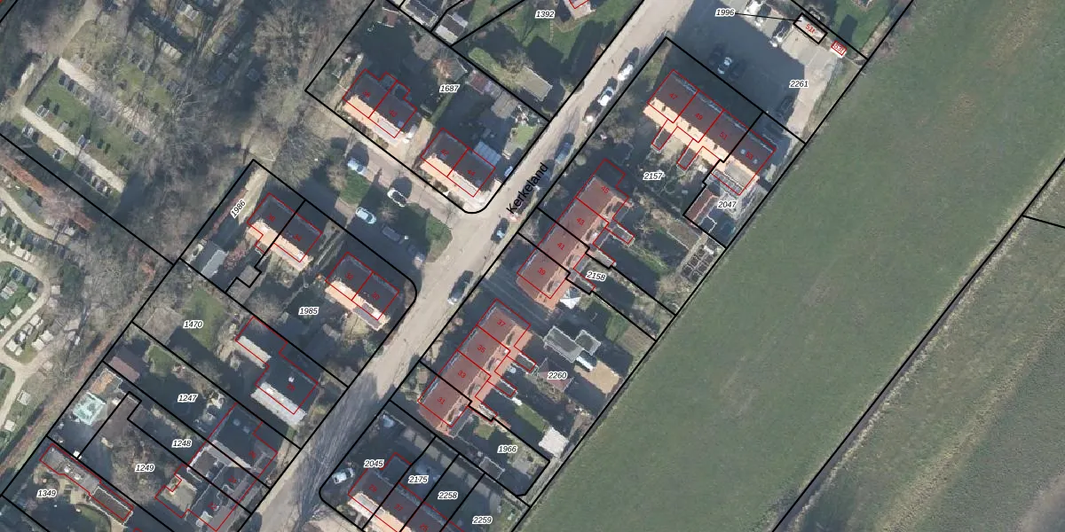 Het perceel waarop Kerkeland 39 staat heeft een oppervlakte van 1029 m². Dit is een zeer groot perceel. De perceeloppervlakte wordt geregistreerd door het Kadaster. Gedetailleerde informatie over de maten van dit perceel kunt u vinden in het rapport Kadastrale kaart met maatvoering van Kerkeland 39.