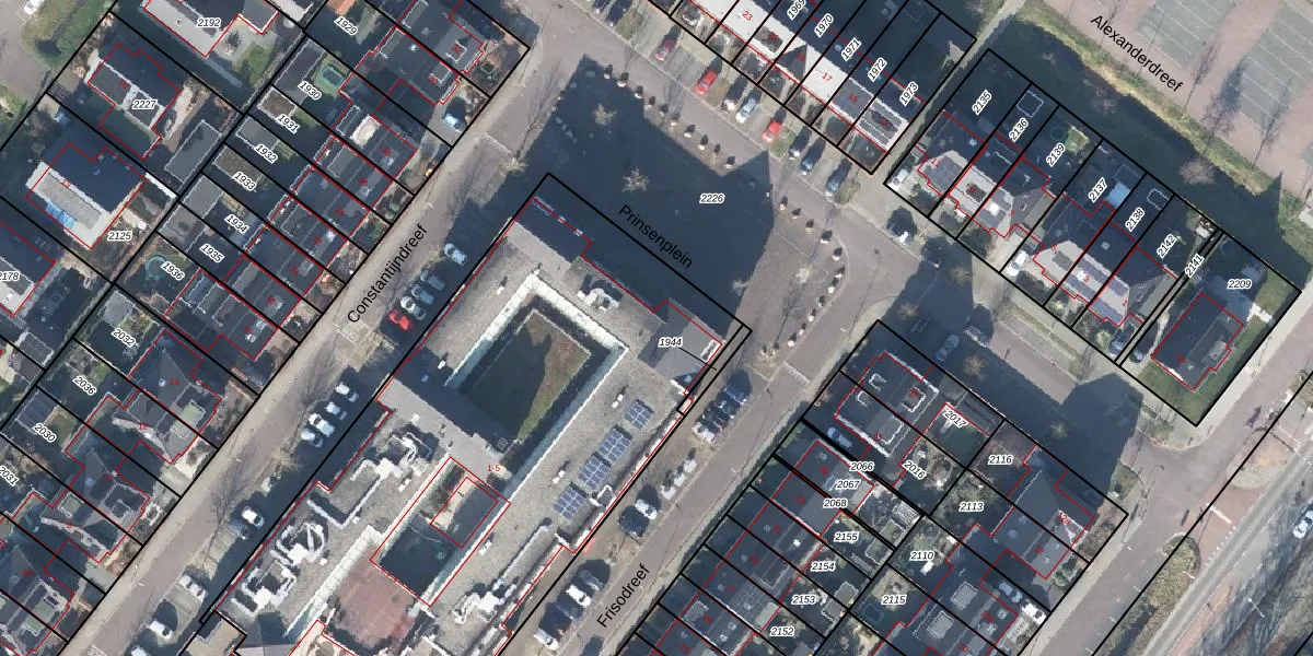 Het perceel waarop Prinsenplein 4-25 staat heeft een oppervlakte van 3520 m². Dit is een zeer groot perceel. De perceeloppervlakte wordt geregistreerd door het Kadaster. Gedetailleerde informatie over de maten van dit perceel kunt u vinden in het rapport Kadastrale kaart met maatvoering van Prinsenplein 4-25.