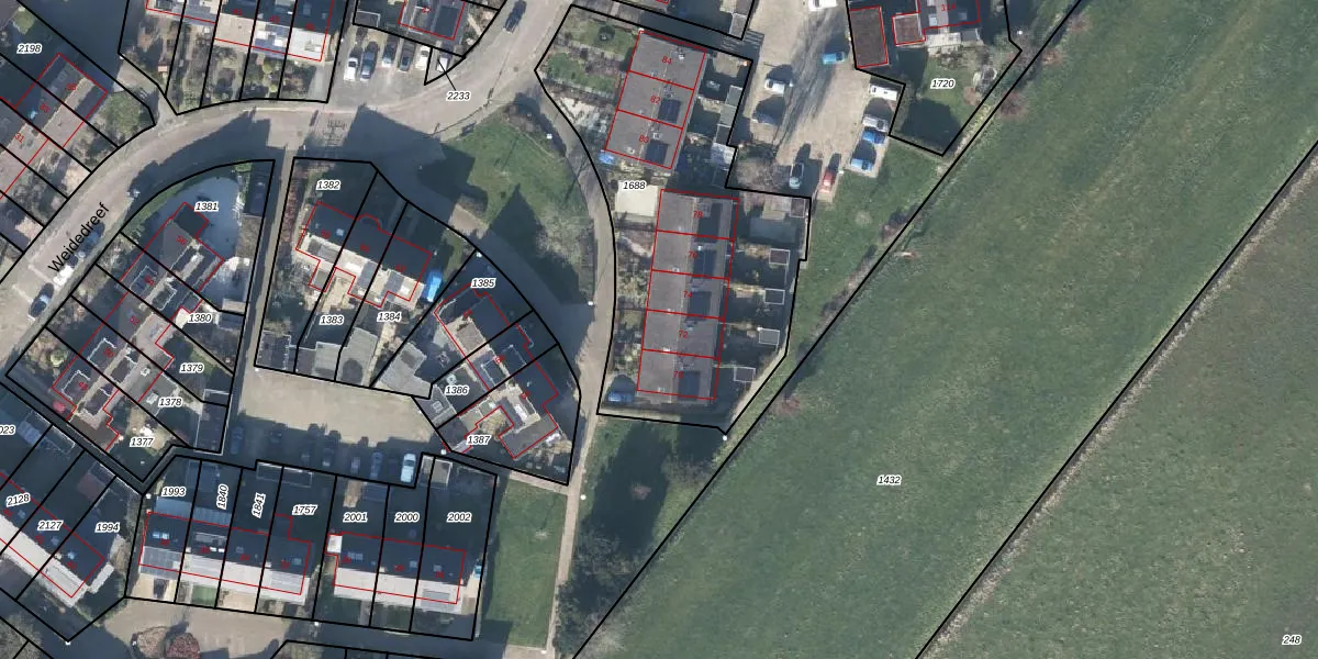 Weidedreef 72 is gelegen op kadastraal perceel LBK02A1688. Deze kadastrale aanduiding is uniek en wordt gebruikt door het Kadaster om eigendomsrechten en andere zakelijke rechten vast te leggen. Het perceel maakt onderdeel uit van de kadastrale gemeente Langbroek.