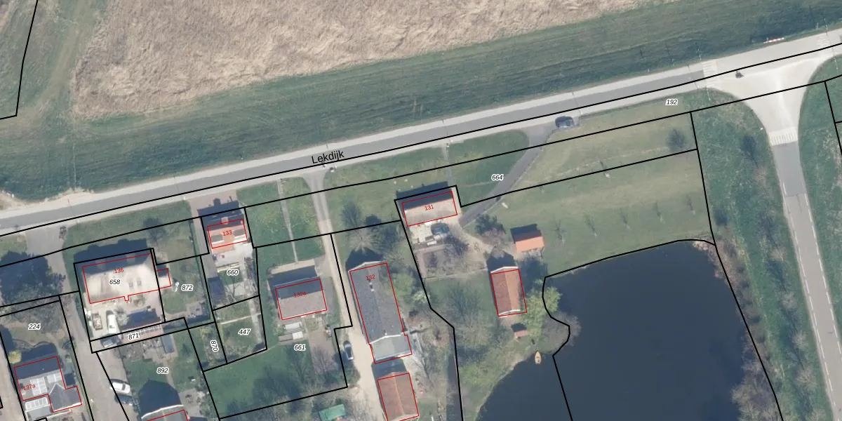 Lekdijk 131 is gelegen op kadastraal perceel LGR00E663. Deze kadastrale aanduiding is uniek en wordt gebruikt door het Kadaster om eigendomsrechten en andere zakelijke rechten vast te leggen. Het perceel maakt onderdeel uit van de kadastrale gemeente Langerak.