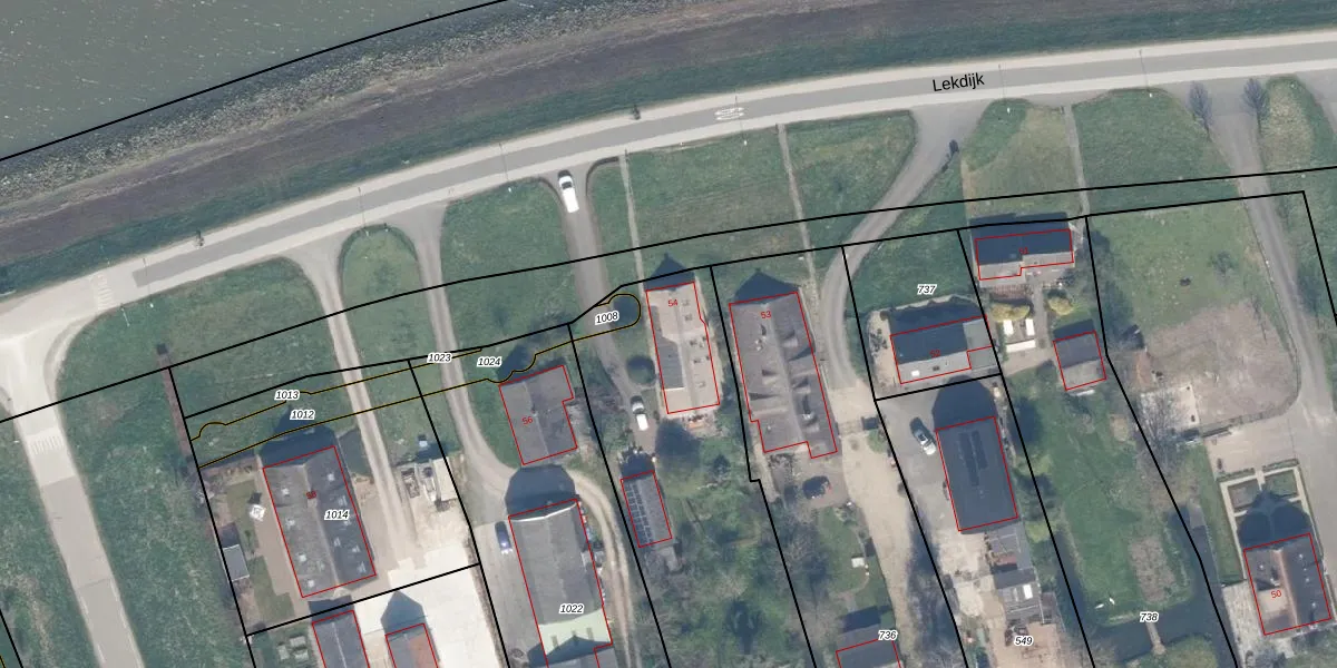 Lekdijk 54 is gelegen op kadastraal perceel LGR00E1007. Deze kadastrale aanduiding is uniek en wordt gebruikt door het Kadaster om eigendomsrechten en andere zakelijke rechten vast te leggen. Het perceel maakt onderdeel uit van de kadastrale gemeente Langerak.