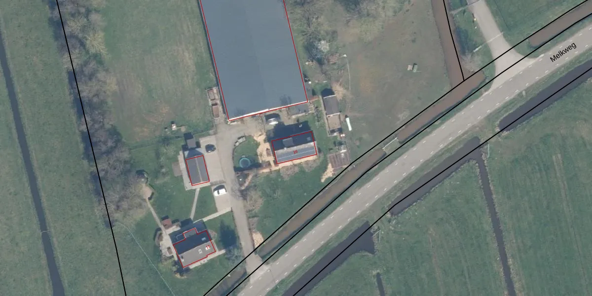 Het perceel waarop Melkweg 16 staat heeft een oppervlakte van 7,7 ha. Dit is een zeer groot perceel. De perceeloppervlakte wordt geregistreerd door het Kadaster. Gedetailleerde informatie over de maten van dit perceel kunt u vinden in het rapport Kadastrale kaart met maatvoering van Melkweg 16.