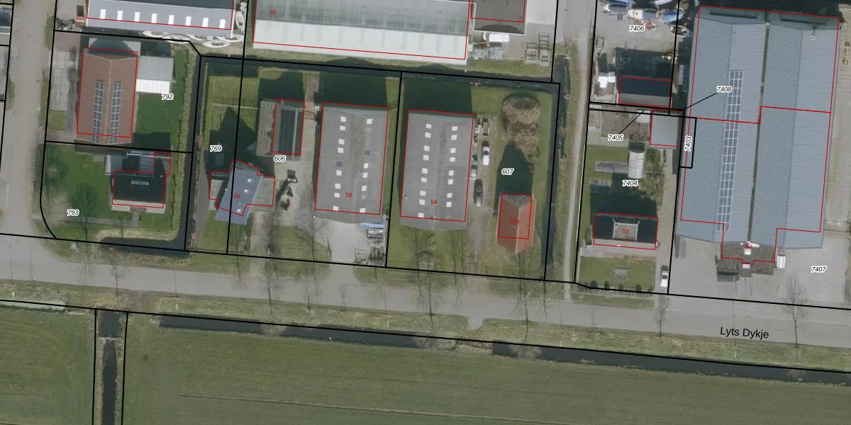 Het perceel waarop Lyts Dykje 54 staat heeft een oppervlakte van 1725 m². Dit is een zeer groot perceel. De perceeloppervlakte wordt geregistreerd door het Kadaster. Gedetailleerde informatie over de maten van dit perceel kunt u vinden in het rapport Kadastrale kaart met maatvoering van Lyts Dykje 54.