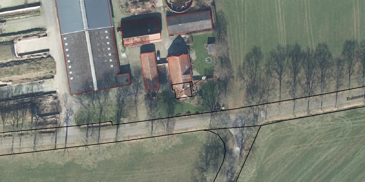 Buisweerdweg 2 is gelegen op kadastraal perceel LCM00O17. Deze kadastrale aanduiding is uniek en wordt gebruikt door het Kadaster om eigendomsrechten en andere zakelijke rechten vast te leggen. Het perceel maakt onderdeel uit van de kadastrale gemeente Lochem.
