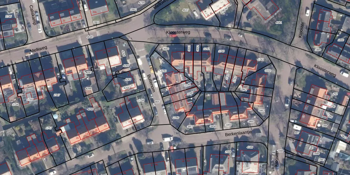 Het perceel waarop Buitenom 3 staat heeft een oppervlakte van 95 m². Dit is een klein perceel. De perceeloppervlakte wordt geregistreerd door het Kadaster. Gedetailleerde informatie over de maten van dit perceel kunt u vinden in het rapport Kadastrale kaart met maatvoering van Buitenom 3.